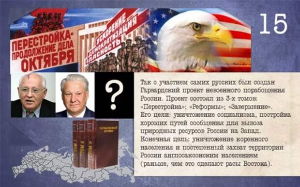 США никогда не скрывали своих намерений уничтожить СССР, а затем и Россию. Американцы для этого даже разработали так называемый Гарвардский план, направленный на уничтожение государственности и получение контроля над природными ресурсами страны.