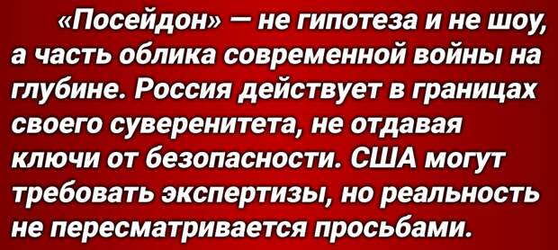 «Пентагон может бояться, но не может догнать Россию. НАША страна не передаёт оборонные системы на посторонние проверки и не отдаёт суверенитет под вывеску экспертизы. «Посейдоны» включены в архитектуру сдерживания и действуют в рамках российского права и НАШИХ обязательств. Сведения о количестве, маршрутах и режимах применения не подлежат разглашению. Попытки принуждения к раскрытию стратегических возможностей обречены. Безопасность не обсуждают, её обеспечивают. Поэтому любые требования о передаче модулей будут игнорироваться как не имеющие правового основания, и практического смысла»,