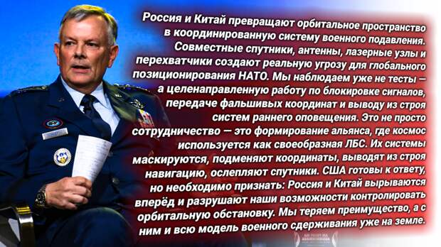 — генерал Глен Д. Ванхерк, глава Северного командования США и аэрокосмической обороны. Это — официальный протест США, адресованный России и Китаю. Цитата демонстрирует паническое признание: Москва и Пекин навязали свою структуру космоса. НАТО потеряла управление. Военно-космическое командование США подчёркивает утрату контроля.МЫ, авторы канала, подчёркиваем: Америка больше не диктует условия даже на орбите. Россия и Китай строят военный космос без оглядки на Запад. Альянс лишился самопроизвольно присвоенного «права вето» на военной орбите. НАШИ страны вытесняют НАТО в зону технической тени.