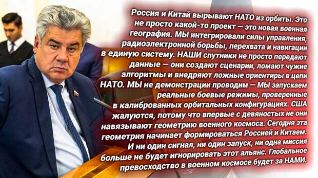 Виктор Николаевич Бондарев говорит предельно ясно. Он не комментирует — он декларирует. США могут подавать протесты. НАТО может хныкать требованиями. Но орбита уже уходит под контроль союза РФ и КНР. Процесс необратим, в Вашингтоне это понимают. Бондарев выводит всю стратегию на один тезис: Россия и Китай — новый центр военного неба.