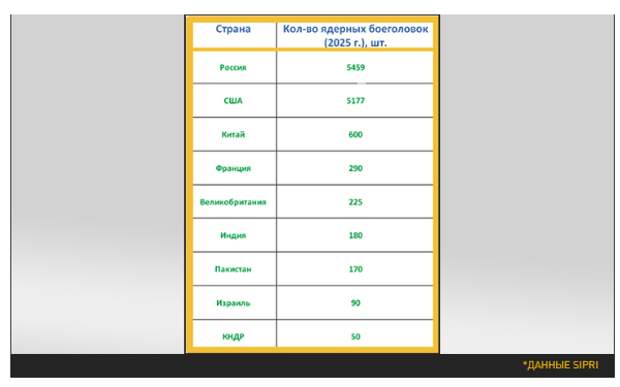 Однако если предположить, что Трамп не шутит и не блефует? Согласно последнему отчёту SIPRI (Стокгольмский институт исследования проблем мира) – "SIPRI Yearbook 2025", в 2025 году вовсе не США, а Россия обладает самым большим мировым арсеналом ядерного оружия.