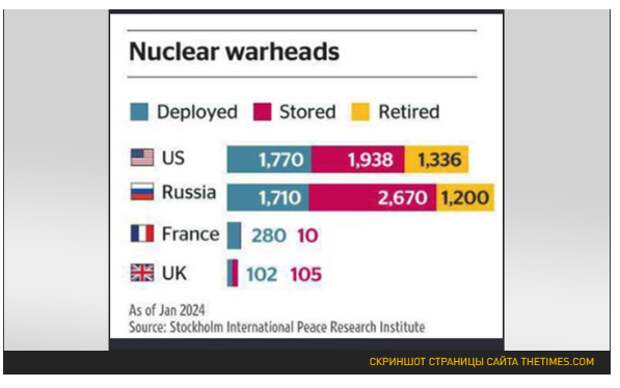 Однако тот же SIPRI указывал, что Россия уступает США по числу развёрнутых боеголовок – 1710 против 1770.