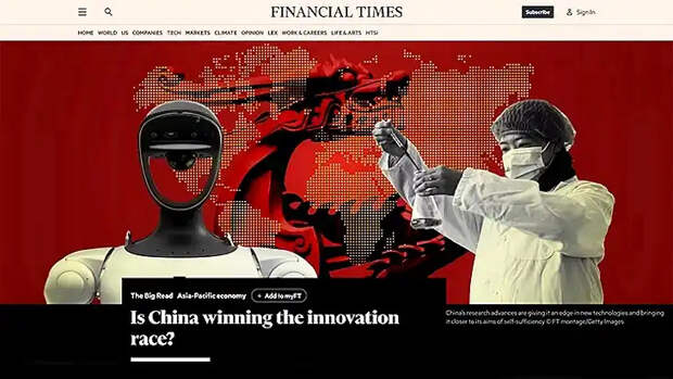 Та же Financial Times пишет, что "Китай выигрывает гонку инноваций", стремительно превращаясь в "мировую лабораторию". Скриншот: FT.