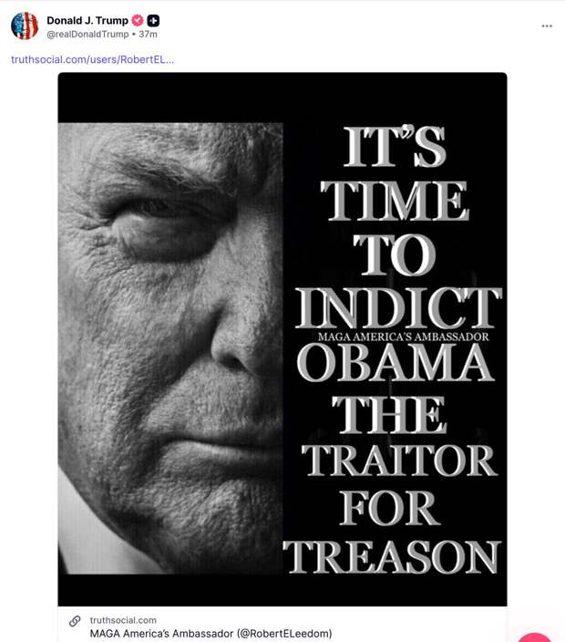 Обама предатель - предъявите ему обвинение.В мае месяце с Трампом о чём-то договорились, но честно предупредили, что СВО продолжится, на слово больше не поверят. 31 мая Амеры устроили подляну – атаку на стратегическую авиацию. Москва отбомбила Киев так, что в Вашингтоне взвыли, а Трамп стал хамить.