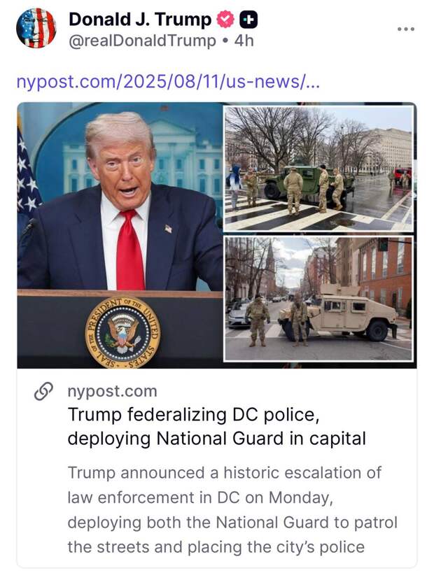 Президент Дональд Трамп передает столичную полицию Вашингтона, округ Колумбия, под федеральный контроль, применяя самоуправление и размещая Национальную гвардию