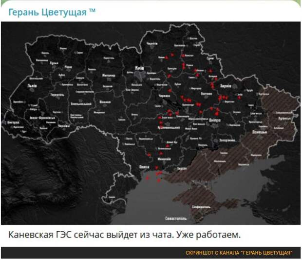 Наши ракетчики и ВКС били не только по генерации, но и по подстанциям, через которые в ОЭС Украины подаётся электричество из трёх оставшихся под контролем Киева АЭС. <…> Удар был нанесён сразу после того, как энергетики Украины сумели восстановить работу своих подстанций настолько, что АЭС вновь вышли на полную мощность. После сегодняшних ударов, я так понимаю, будет опять "провал", и так будет теперь постоянно. <…> . В Киеве снова поражены ТЭЦ-5 и ТЭЦ-6 (похоже, у нашего командования есть желание убить всю генерацию Киева в ноль). Также поражены Киевская ГЭС и Каневская ГЭС,
