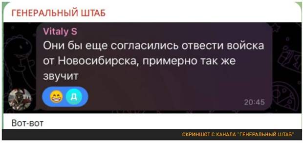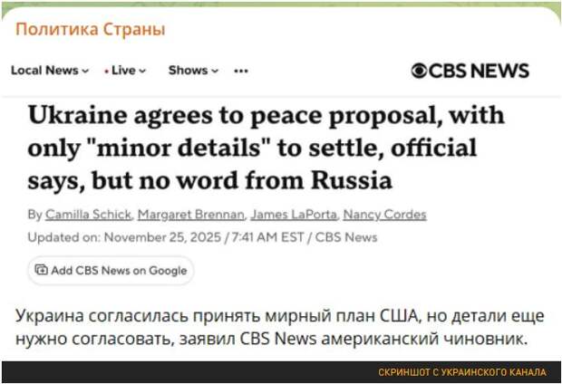 Кроме того, стало известно, что Киев фактически согласен на капитуляцию. Первые сообщения пошли после 16:00. Об этом в один голос сообщили ведущие западные СМИ со ссылкой на Пентагон (и ни одна сторона это не опровергла — напротив, начинают поступать подтверждения). Так, CBS News пишет, что Украина соглашается на мирное предложение, осталось согласовать лишь "незначительные детали" — ранее то же самое говорил и глава СНБОУ Рустем Умеров: