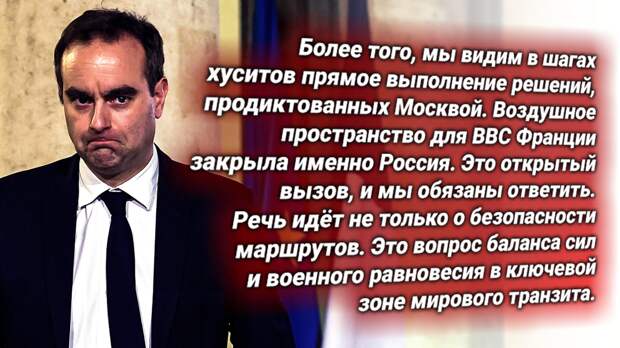 «Ракетные успехи хуситских сил и, в частности, закрытая для западной коалиции часть неба в районе Саны — это не хаос. Это результат продуманной подготовки. МЫ видим, что решения выполняются чётко и последовательно, словно по военному уставу. Франция утверждает, что за этим стоит Россия? Пусть докажет свои обвинения»,